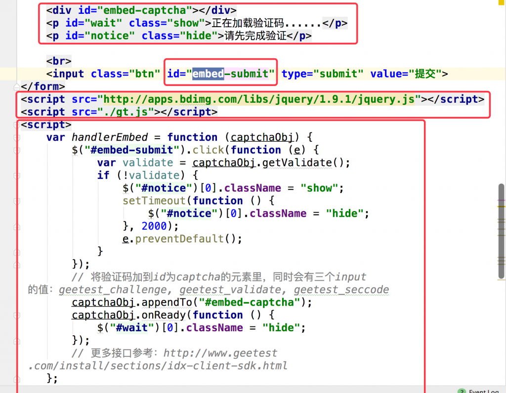 1.复制login.html当中的代码到你自己的前台登录页面当中,如下图(红色色块代表你要复制的内容,并修改Js引入路径):