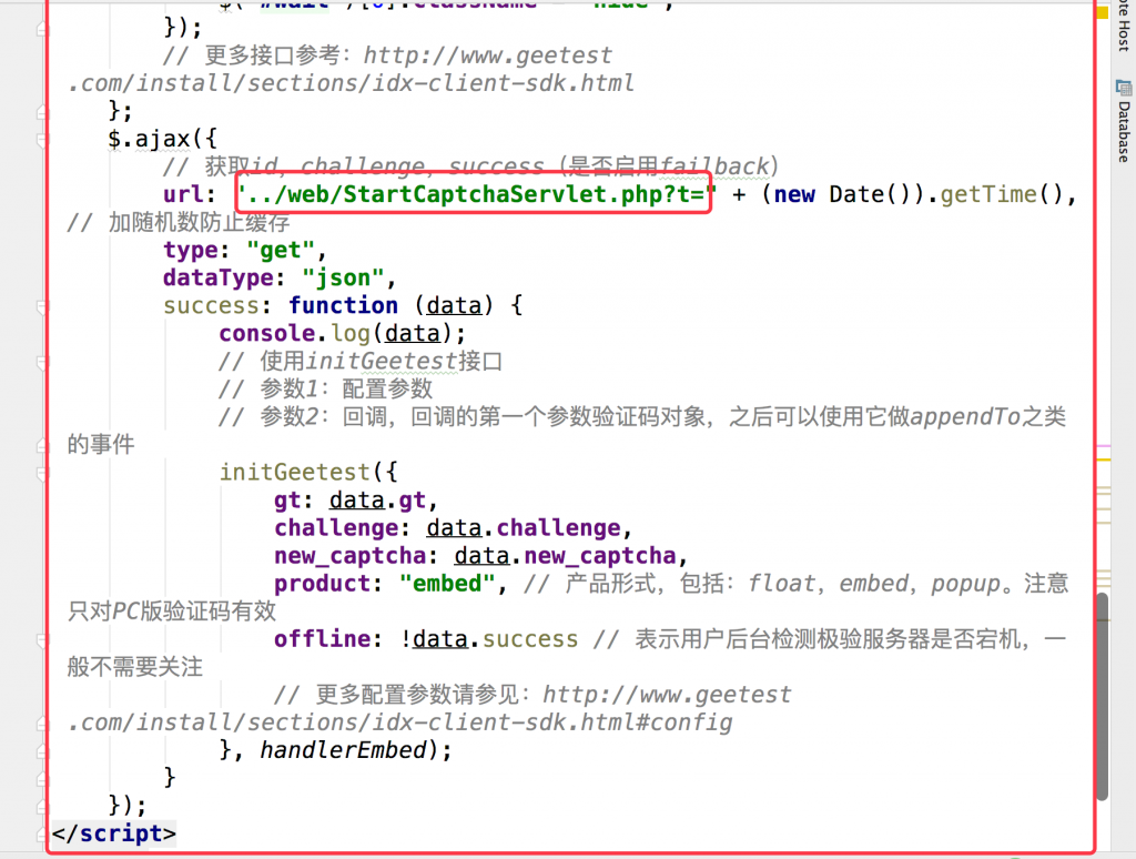 2.上图Ajax需要发送数据到StartCaptchaServlet.php这个文件中。所以我们可以将StartCaptchaServlet.php文件中的代码复制到你自己的项目后台作为一个方法。并且注意以下图片红色色块当中的路径。