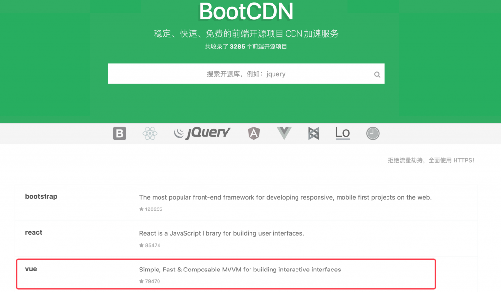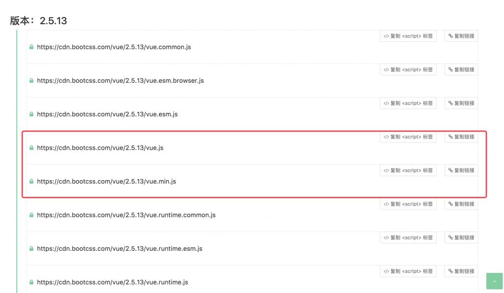 拿最近研究的 Vue.Js 来说,我们可以进入国内的 CDN库 选择Vue,如下图: