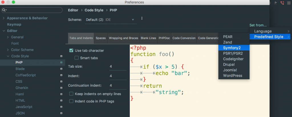 `Editor>Code Style>PHP` 点击 `Set From...` ,推荐使用 `Symfony2`