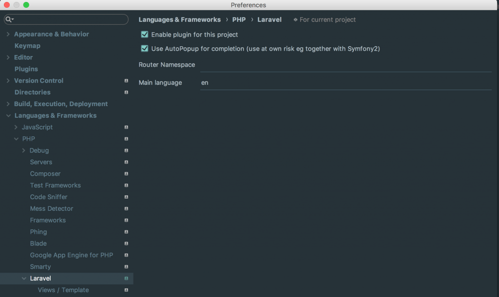 `Settings > Languages & Frameworks > PHP > Laravel` 点击开启 `Enable for this project`;